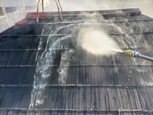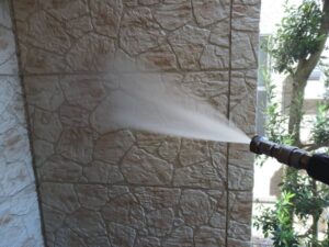 高圧の水をぶつけて、汚れや古い塗膜・チョーキング粉などを物理的に落とす作業。